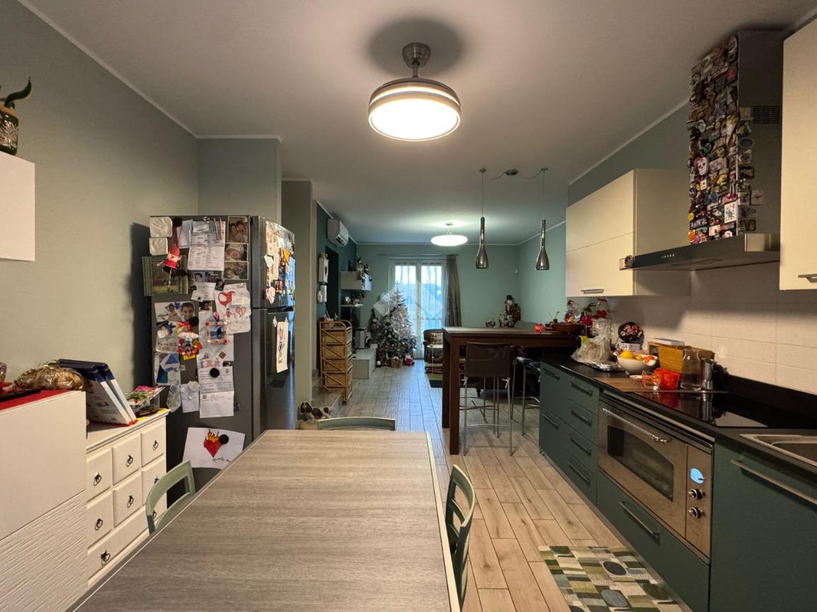 L’ingresso si apre su un’ampia e luminosa zona giorno, composta da salone e cucina abitabile a vista, valorizzata dall’accesso diretto al terrazzo.