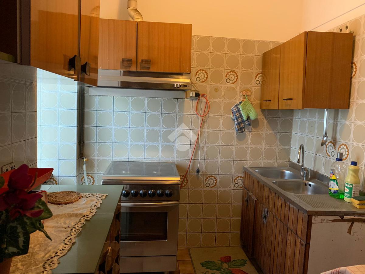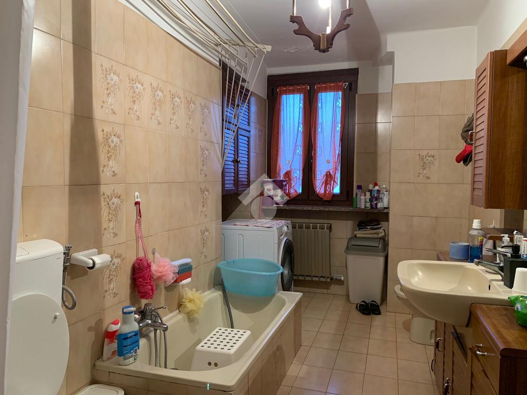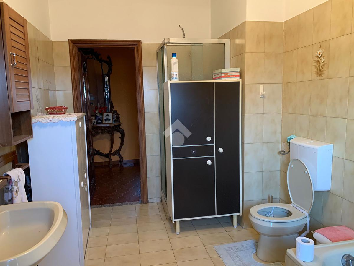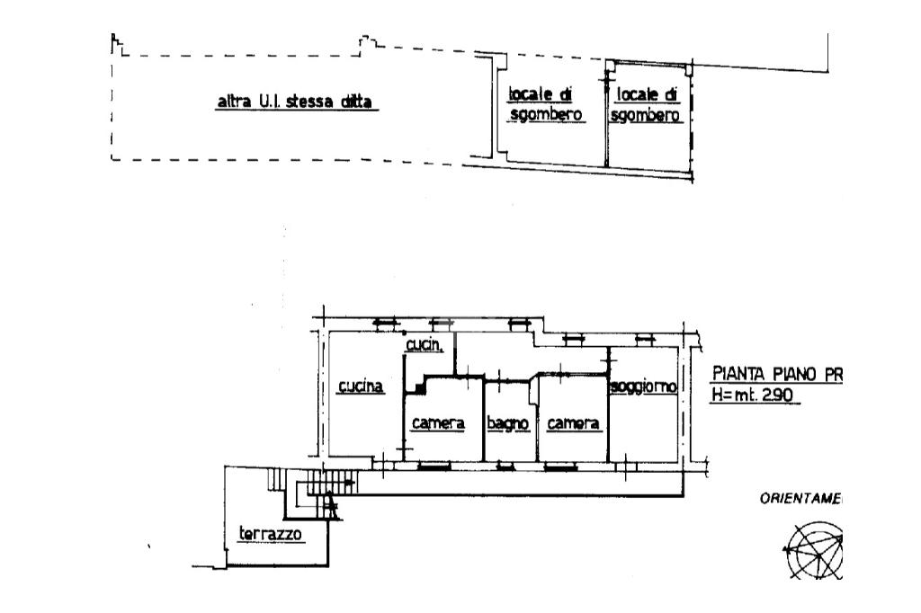 Al primo piano, il secondo alloggio: l’ingresso è direttamente sulla sala da pranzo separata dalla cucina abitabile e dal salotto. Le camere da letto matrimoniali sono due e il bagno è finestrato con vasca.