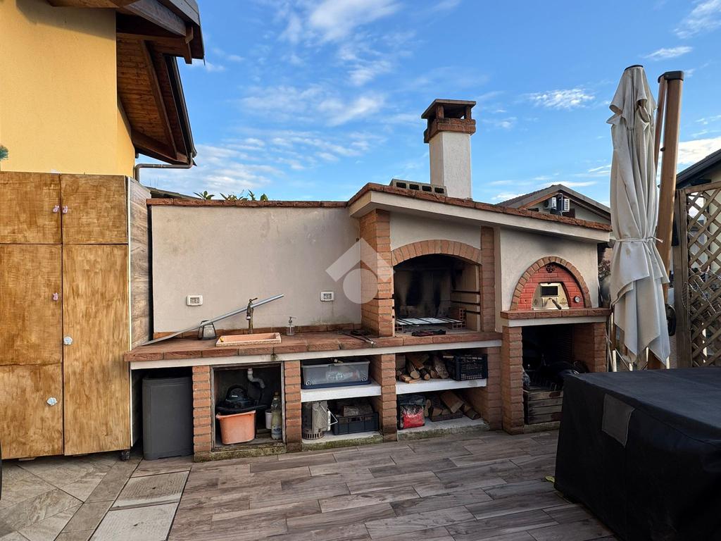 L’area esterna, di circa 130 mq, è ben distribuita tra zona verde e area piastrellata ed è arricchita da un barbecue in muratura e da un forno per pizze.