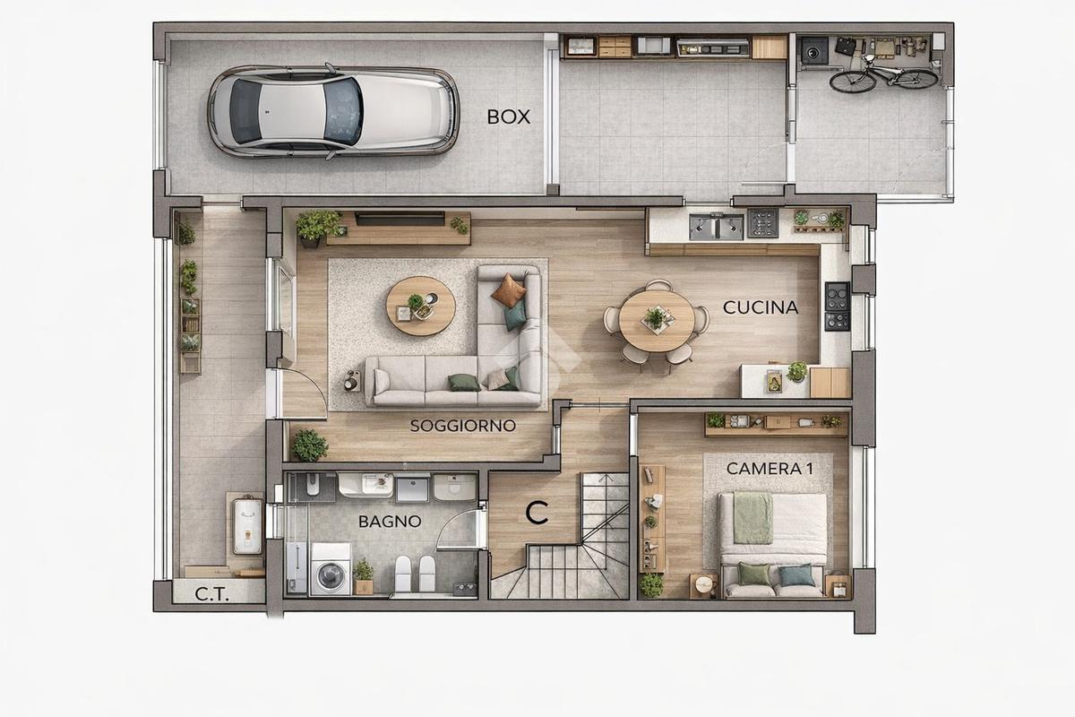 Al piano terra, l’ingresso conduce a un ampio e luminoso soggiorno, separato dalla cucina abitabile. Un comodo disimpegno, che funge anche da vano scale, accompagna alla camera matrimoniale e al bagno finestrato con doccia.