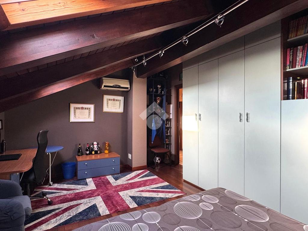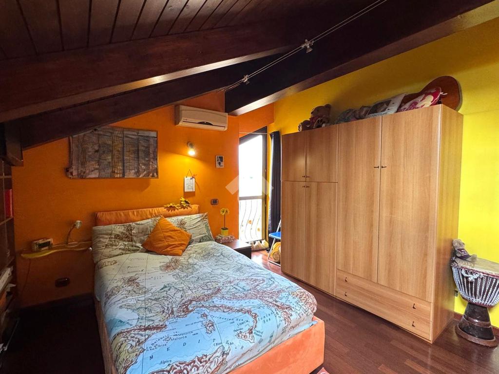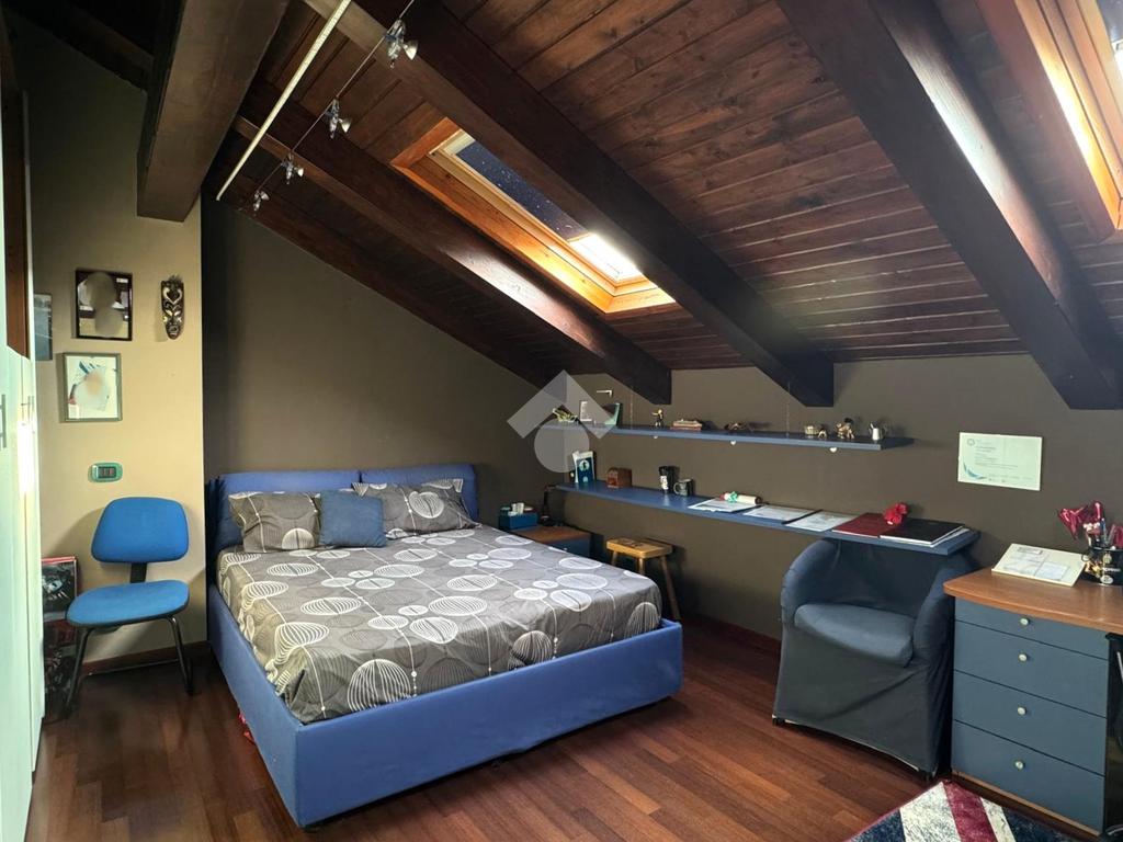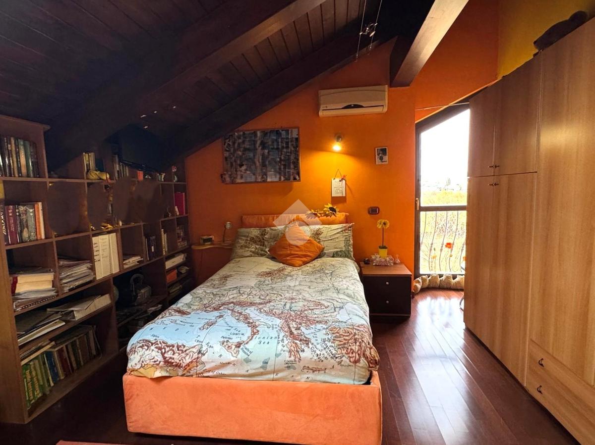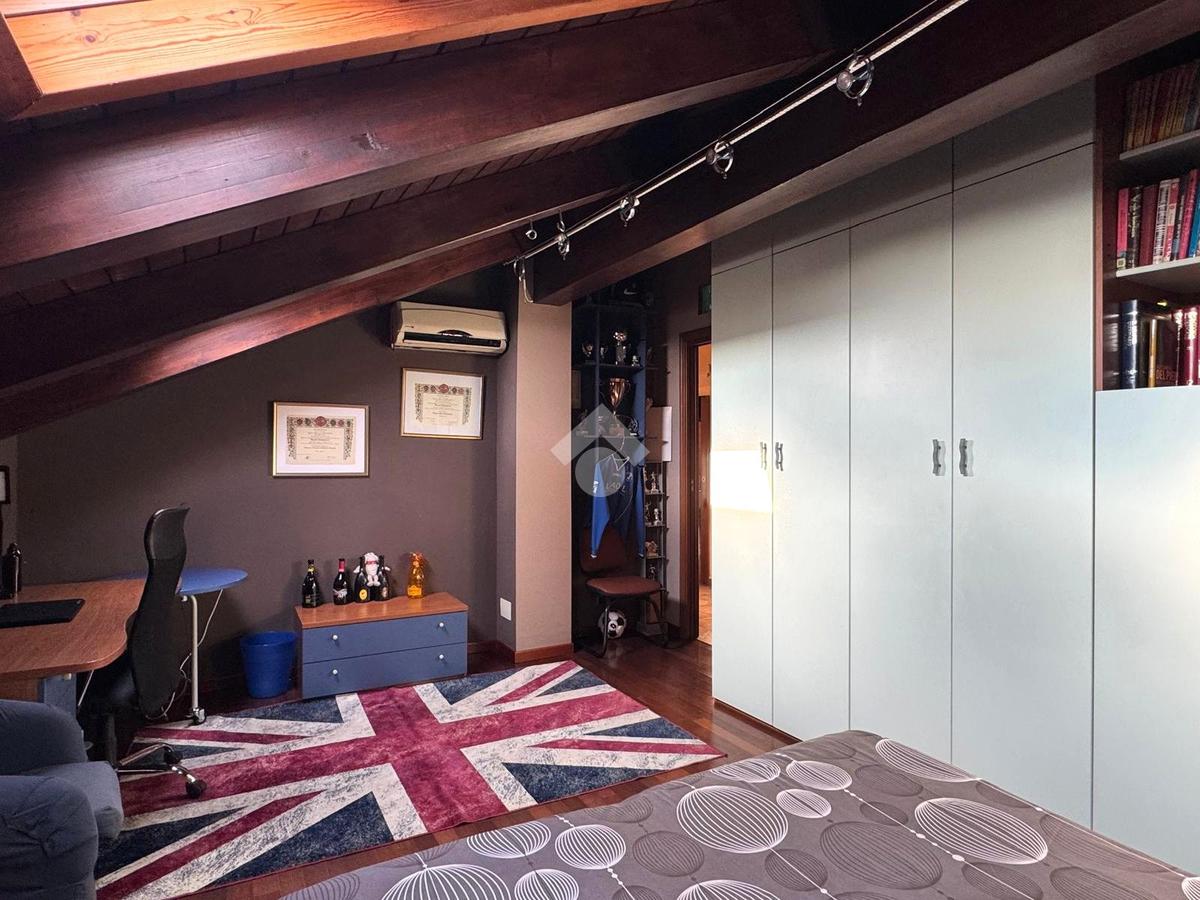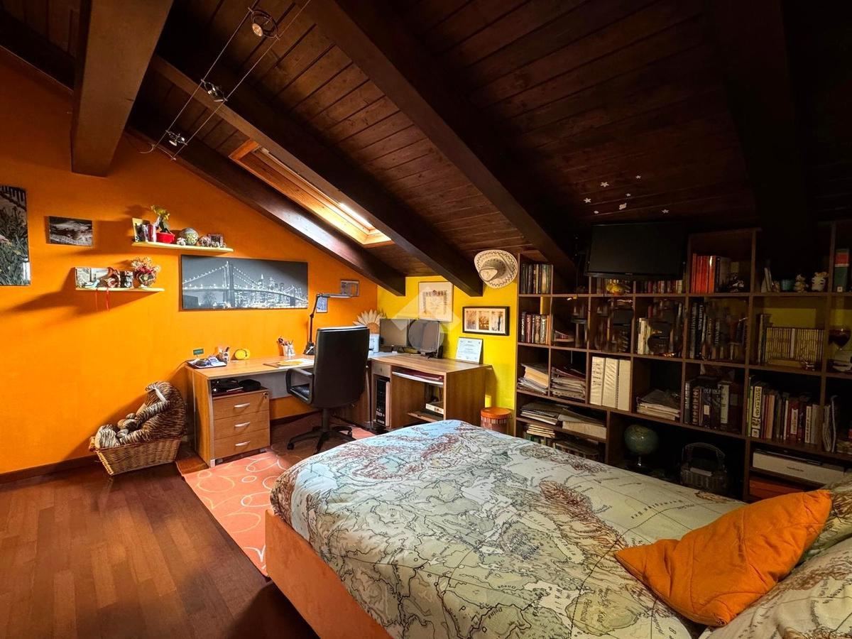 Una comoda scala interna accompagna al piano mansardato abitabile, impreziosito da travi a vista. Un pratico disimpegno distribuisce gli ambienti notte: camera matrimoniale con cabina armadio, due camere di generose dimensioni, di cui una con balcone alla francese, e bagno con doccia walk-in con illuminazione LED e balcone alla francese. Il piano è dotato di riscaldamento a pavimento.